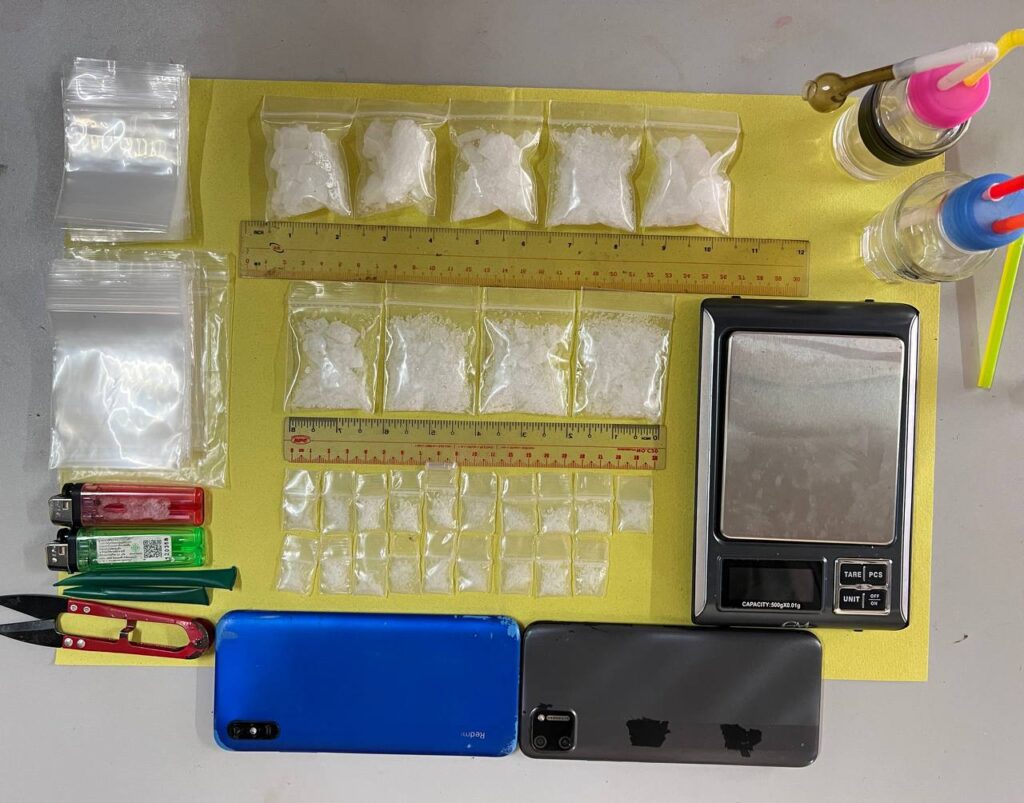 ១/ម្សៅក្រាមពណ៌សថ្លាសង្ស័យជាសារធាតុញៀន(ម៉ាទឹកកក) ចំនួន២៨កញ្ចប់(តូច១៩កញ្ចប់ធំ៩កញ្ចប់)ទំងន់(៨៥.៩ក្រាម)។