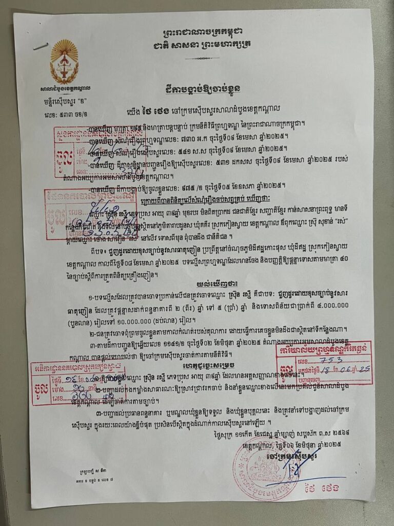 ៣-ឈ្មោះស្រ៊ុន រស្មីភេទប្រុស អាយុ៣៩ឆ្នាំជនជាតិខ្មែរមុខរបរ មិនពិតមានទីលំនៅភូមិតារាបឃុំគគីរស្រុកកៀនស្វាយ ខេត្តកណ្តាលមានដីកាចាប់ខ្លួនចេញដោយលោកថៃ.ថេងចៅក្រមស៊ើបសួរសាលាដំបូងខេត្តកណ្តាលលេខ៥៣៣.ច.ខ/ឌ ចុះថ្ងៃទី០៦ខែមិថុនាឆ្នាំ២០២៥ (ឃាត់ខ្លួន)(ជួញដូរ) ។