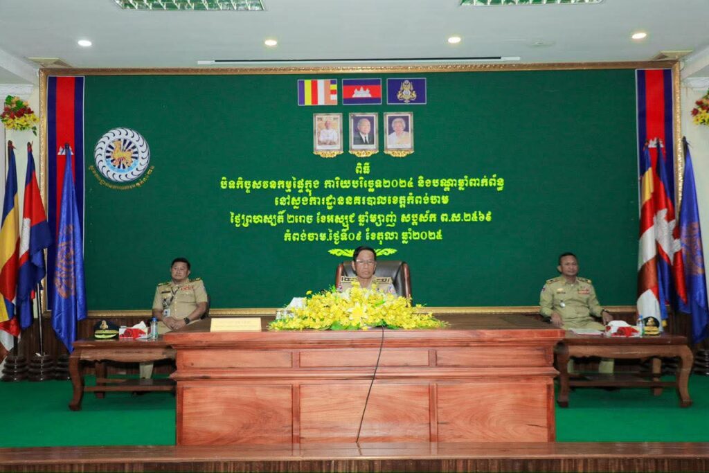 នាក្នុងឱកាសនោះដែរ លោកឧត្តមសេនីយ៍ទោ ហេង វុទ្ធី ស្នងការនគរបាលខេត្តកំពង់ចាម បានអញ្ជើញរាយការណ៍ជូន ឯកឧត្តម អគ្គនាយក អំពីសភាពការណ៍ និងលទ្ធផលសំខាន់ៗ ដែលសមត្ថកិច្ចស្នងការដ្ឋាននគរបាលខេត្តកំពង់ចាមសម្រេចបាន ក្នុងរយៈពេលកន្លងមក ដែលត្រូវបានផ្តោតសំខាន់ លើការពង្រឹងអភិបាលកិច្ចល្អ សុចរិតភាព នៃការគ្រប់គ្រងបុគ្គលិក ការគ្រប់គ្រងហិរញ្ញវត្ថុសាធារណៈ ការគ្រប់គ្រងទ្រព្យសម្បត្តិរដ្ឋ ព្រមទាំងការអភិវឌ្ឍសមត្ថភាពអង្គភាពទាំងនៅស្នងការដ្ឋាន អធិការដ្ឋាន និងប៉ុស្ដិ៍នគរបាលរដ្ឋបាល ដែលស្ថិតក្រោមដែនសមត្ថកិច្ចរបស់ខ្លួនជាប្រចាំ និងត្រូវបានបង្កើនល្បឿន ប្រកបដោយប្រសិទ្ធភាព ក្នុងការអនុវត្តការងារជំនាញ ស្របតាមផែនការសកម្មភាព នៃអគ្គស្នងការដ្ឋាននគរបាលជាតិ ។