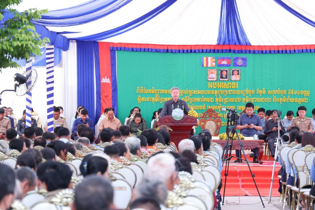 ការលើកឡើងនេះធ្វើឡើងកាលពីព្រឹកថ្ងៃទី២០ ខែវិច្ឆិកា ឆ្នាំ២០២៥ ក្នុងពិធីចែកវិញ្ញាបនបត្រសម្គាល់ម្ចាស់អចលនវត្ថុជូនប្រជាពលរដ្ឋចំនួន ៥ភូមិ សរុបចំនួន ៥៩១១ បណ្ណ គឺភូមិព្រែកតាកែវ ភូមិជ្រោយដង ភូមិជ័យឧត្តម២ ភូមិព្រែកតាកែវ២ ភូមិជ្រោយដង២ ឃុំសំរោងធំ ស្រុកកៀនស្វាយ ខេត្តកណ្តាល ក្រោមអធិបតីភាពឯកឧត្តម ឈឿន ប៊ុណ្ណារ័ត្ន រដ្ឋលេខាធិការក្រសួងរៀបចំដែនដី នគរូបនីយកម្ម និងសំណង់ និងជាប្រធានក្រុមការងារសម្របសម្រួលដោះស្រាយវិវាទដីធ្លីខេត្តកណ្តាល និងឯកឧត្ដម គួច ចំរើន អភិបាល នៃគណៈអភិបាលខេត្តកណ្ដាល នៅបរិវេណវត្តជ័យមង្គល។