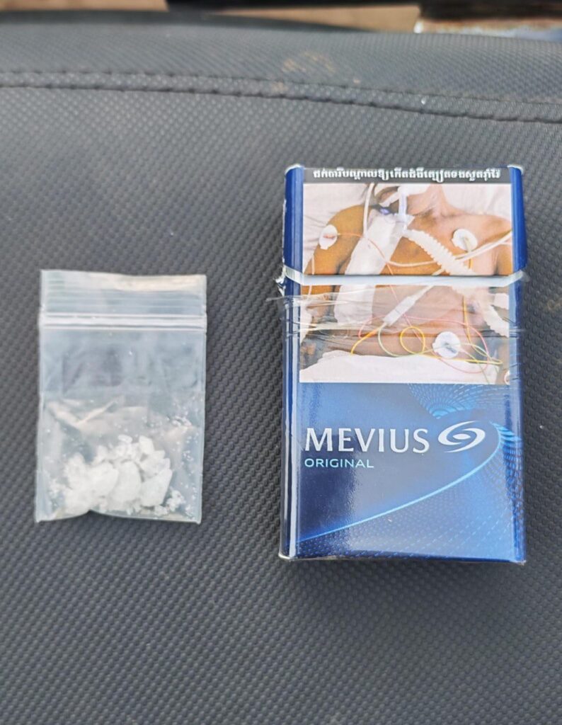 ម៉្សៅក្រាមពណ៏សថ្លាសង្ស័យជាសារធាតុញៀន(ម៉ាទឹកកក)០១កញ្ចប់តូចមានទំងន់០.០៨ក្រាមនិងវត្ថុតាងវេចខ្ចប់និងប្រើប្រាស់មួយចំនួន។