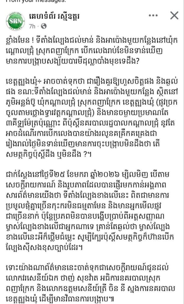 ខេត្តត្បូងឃ្មុំ ស្នងការដ្ឋាននគរបាលខេត្តត្បូងឃ្មុំ សូមគោរពថ្លែងអំណរគុណចំពោះ បងប្អូនប្រជាពលរដ្ឋ និងអ្នកសារព័ត៌មាន ដែលបានផ្ដល់ព័ត៌មានតាមរយៈលេខទូរស័ព្ទប្រចាំបញ្ជា របស់ស្នងការដ្ឋាននគរបាលខេត្តត្បូងឃ្មុំ និងការចុះផ្សាយតាមបណ្តាញទំនាក់ទំនងសង្គម ពាក់ព័ន្ធករណីមានការលួចលេងល្បែងស៊ីសងខុសច្បាប់នៅក្នុងភូមិអន្លង់ប៊ូ ឃុំកណ្តោលជ្រុំ ស្រុកពញាក្រែក ក្រោយទទួលបានព័ត៌មានភ្លាម លោកឧត្តមសេនីយ៍ស្នងការ បានចាត់កម្លាំងនគរបាលជំនាញខេត្ត និងអធិការដ្ឋាននគរបាលស្រុកពញាក្រែក បានចុះដល់ទីតាំងគឺពុំមានមនុស្សកំពុងលេងនោះទេ ប៉ុន្តែយើងពិនិត្យឃើញថាពិតជាមានការលួចលេងថ្មីៗ កម្លាំងយើងបានធ្វើការដុតបំផ្លាញសម្ភារៈ ដែលក្រុមអ្នកញៀនល្បែងបានរៀបចំជាសង្វៀនប្រជល់មាន់ចោល និងបន្តស្រាវជ្រាវរកម្ចាស់ទីតាំងដីខាងលើ ដើម្បីចាត់វិធានការរដ្ឋបាល ឬ/និងចាត់វិធានការច្បាប់ក្នុងករណីដែលរកឃើញថាបានផ្តល់ទីតាំង ឬចាត់ចែងឲ្យមានល្បែងស៊ីសងខុសច្បាប់។
