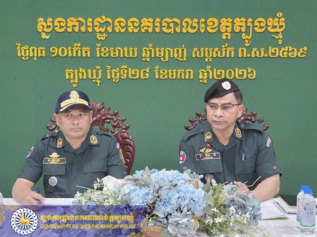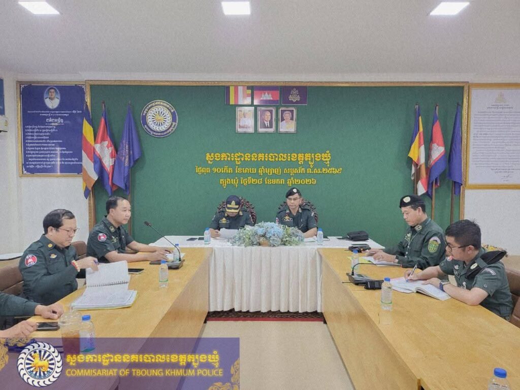 ខេត្តត្បូងឃ្មុំ ៖ នៅរសៀលថ្ងៃពុធ ទី២៨ ខែមករា ឆ្នាំ២០២៦ ដោយអនុវត្តតាមបទបញ្ជាដ៏ខ្ពង់ខ្ពស់របស់ ឯកឧត្តម នាយឧត្តមសេនីយ៍ ស ថេត អគ្គស្នងការនគរបាលជាតិ នៅសាលប្រជុំសេនាធិការដ្ឋាន នៃស្នងការដ្ឋាននគរបាលខេត្ត លោកឧត្តមសេនីយ៍ទោ ចិន នី ស្នងការនគរបាលខេត្តត្បូងឃ្មុំ និងលោកឧត្តមសេនីយ៍ទោ ស៊ិន រដ្ឋា អនុប្រធាននាយកដ្ឋានព្រហ្មទណ្ឌ និងជាប្រធានក្រុមការងារ បានដឹកនាំកិច្ចប្រជុំបូកសរុបសភាពការណ៍ និងលទ្ធផលការងារ សហការស្រាវជ្រាវ ស៊ើបអង្កេត បង្ការ ទប់ស្កាត់ និងបង្ក្រាបបទល្មើសព្រហ្មទណ្ឌ ក្នុងភូមិសាស្ត្រខេត្តត្បូងឃ្មុំ ។