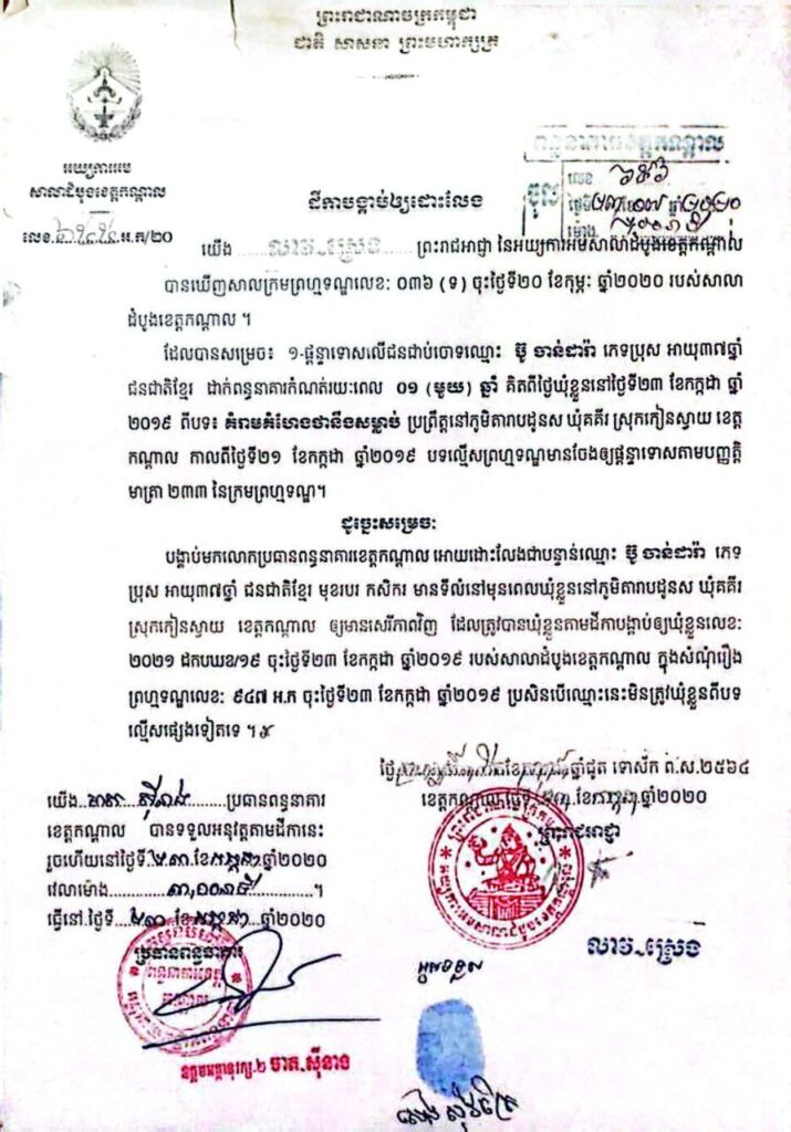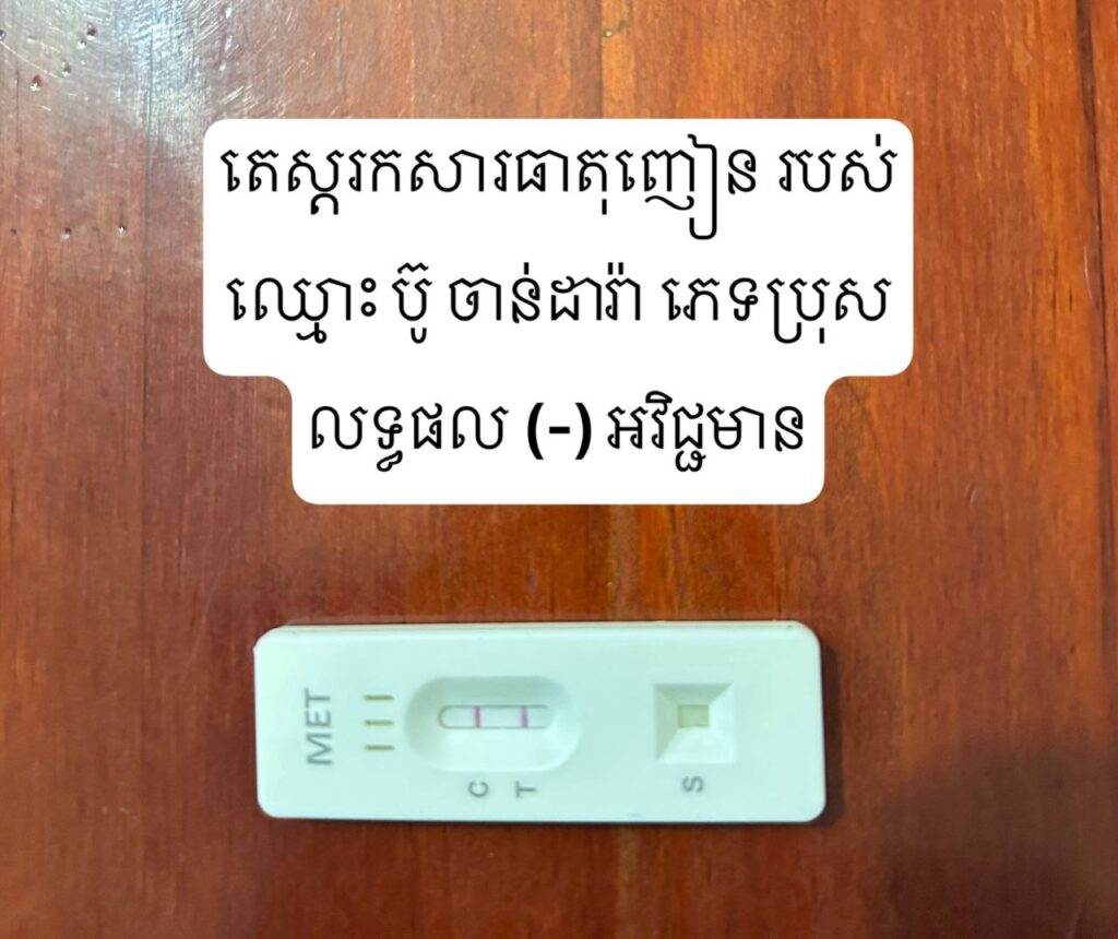 ឈ្មោះប៊ូ ចាន់ដារ៉ា ភេទប្រុសអាយុ៤៥ឆ្នាំ ជនជាតិខ្មែរ មុខរបរនៅផ្ទះមានទីលំនៅភូមិដូនសរ ឃុំគគីរឮស្រុកកៀនស្វាយខេត្តកណ្ដាល(ជនវិបល្លាសស្មារតី ឃាត់ខ្លួន).